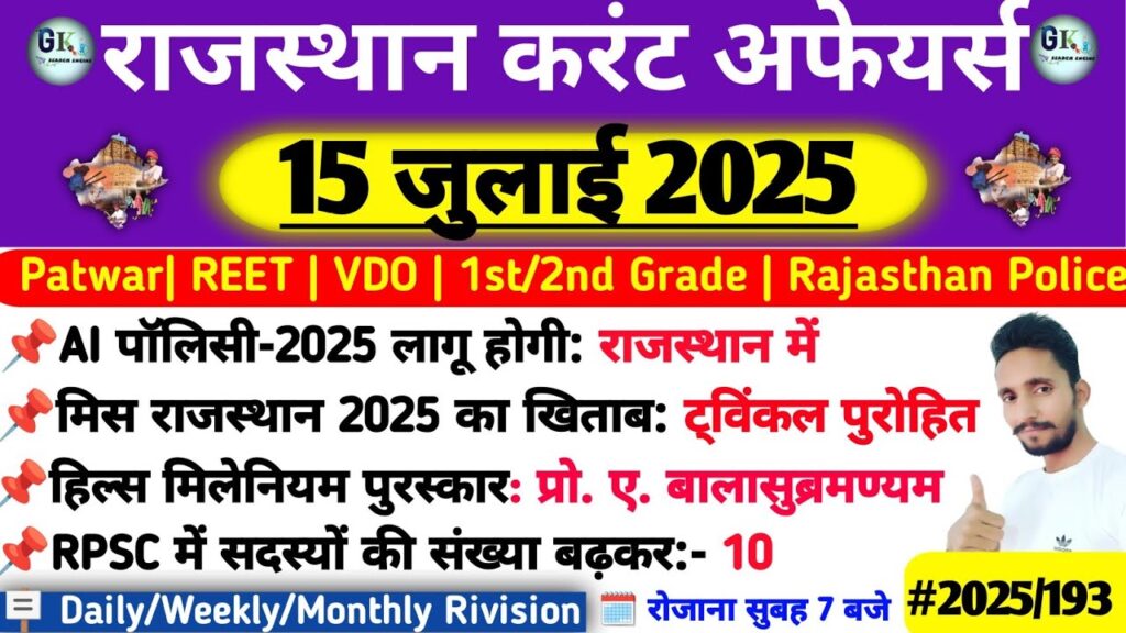 राजस्थान करंट अफेयर्स – 15 जुलाई 2025 | टॉप 5 MCQs प्रश्नोत्तर के साथ